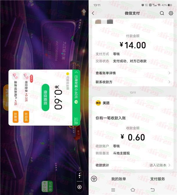 美团的一个简单活动,通过打开美团APP进去JJ斗地主小程序里,按照提示完成3局简单的斗地主就行(前面3局很简单,几乎都是炸弹),每赢1局都会得到0.2元现金红包,3局就是0.6元,玩了3局之后可以直接提现0.6元到微信,提现后目前秒推,如果美团没有绑定微信的,就需要再去美团钱包里提现。