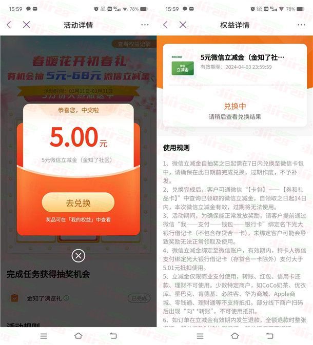 光大银行春暖花开初春礼抽5-68元微信立减金 亲测中5元