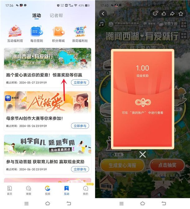 参加潮新闻举办的“潮闻西湖有爱就行”线上爱心跑抽现金红包活动,通过下载打开“潮新闻”APP,点底部“互动”在店“潮闻西湖有爱就行”进去活动里,依次点击完成浏览+点赞+评论+答题任务就可以抽奖(答案是:2年),每天可以抽1次,有机会中到1-5元现金红包,小编测试中到1元,非必中。