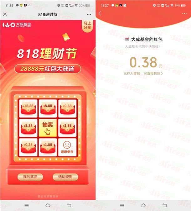 大成基金818理财节抽0.38-18.88元微信红包 亲测中0.38元
