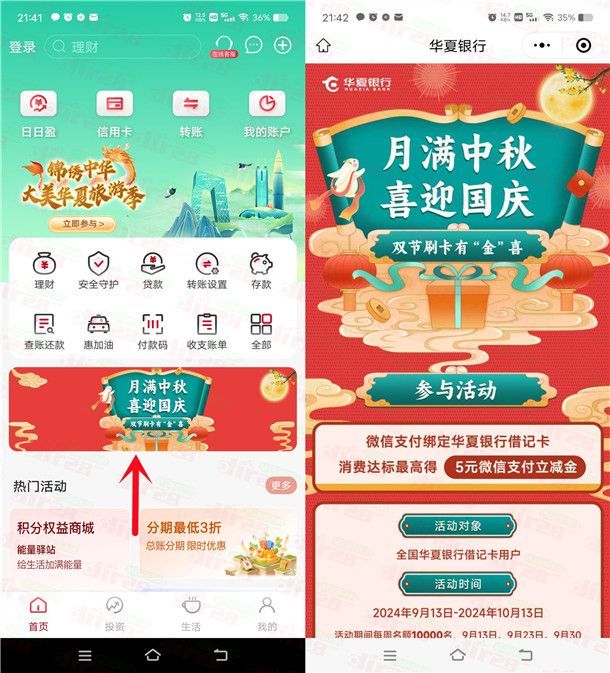 小编提示:注册过华夏银行三类电子卡的都可以去,打开“华夏银行”APP,首页点滚动图【月满中秋喜迎国庆】进去,跳转到微信小程序里,进去可以直接领到1元微信立减金,完成消费达标任务可以领到最高5元微信立减金,在微信支付的时候选择华夏银行卡就可以使用(三类电子卡也可以)
