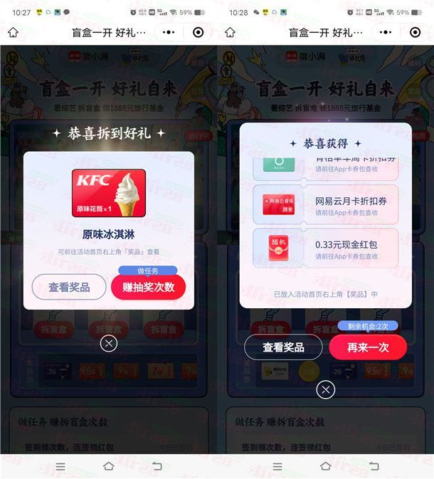 度小满拆盲盒红包雨抽随机现金红包、肯德基冰淇淋、美团外卖券