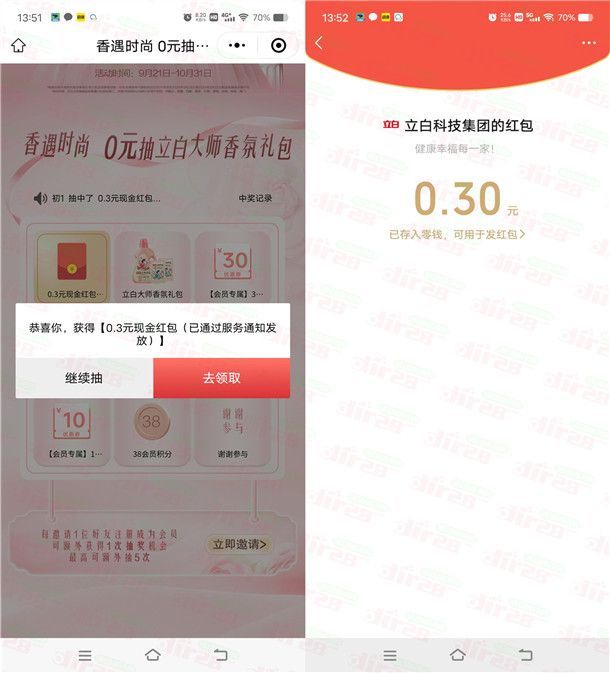 立白小程序香遇时尚抽随机微信红包、实物 亲测中0.3元