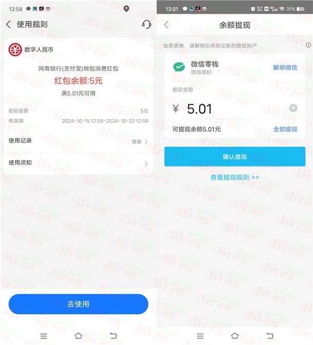2、按照提示一键添加你的网商银行卡到数字人民币钱包就可以领到5元数字人民币红包(秒到支付宝卡包里),可以用支付宝APP付款的时候选择网商银行钱包支付就可以抵扣,也可以用“深圳通”APP充值5.01元再提现到微信(等于用深圳通变现)