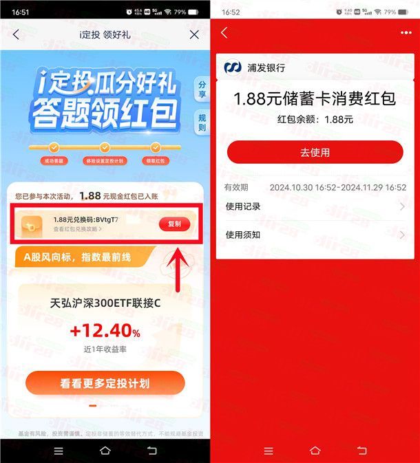 浦发银行i定投领好礼抽最高188元支付宝红包 亲测中1.88元