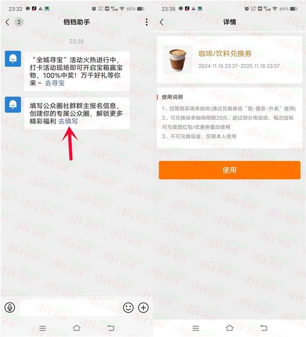 2、报名后再按照提示下载铛铛APP,用参加活动的手机号码注册登录,然后在铛铛消息界面点击【铛铛助手】的消息进去,点击填写公众圈社群群主报名信息进去,报名信息可以随便填,然后再按照提示完成实名认证,就会到账1张咖啡/饮料兑换券,可以在卡包里看到