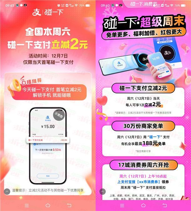 支付宝碰一下超级周末今天立减2元 还有30万份免单 最高免单188元