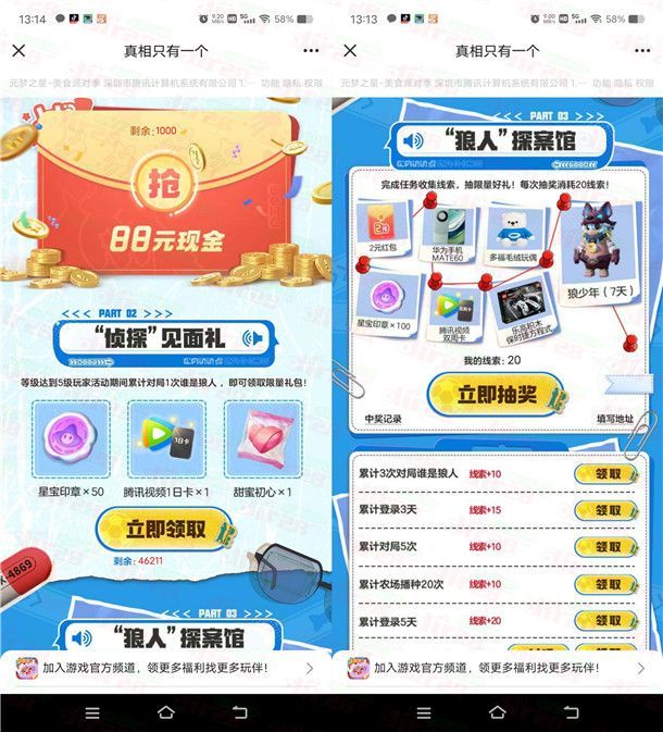 小编提示:有5级的对局1局谁是狼人领1天腾讯视频会员,完成指定的任务抽2元现金红包、腾讯视频会员双周卡(抽奖这个非必中)