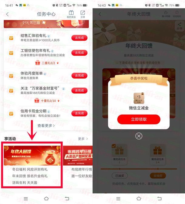 参加工行举办的年终大回馈抽最高88元微信立减金活动,通过打开中国工商银行APP搜索“任务中心”进去,下拉页面在享活动那里左右滑动找到【年终大回馈】点进去,完成4个简单的任务可以抽奖2次,有机会中到3-88元微信立减金,小编测试中到3元秒到。
