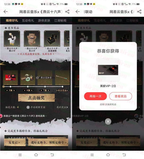 参加网易云音乐举办的收听燕云十六声瓜分50万份黑胶会员活动,通过打开“网易云音乐”APP搜索【燕云十六声】进去,下拉页面完成几个简单的收藏评论任务,抽3次会中2-30天网易云音乐黑胶会员,小编测试中到2天网易云音乐黑胶会员秒到。