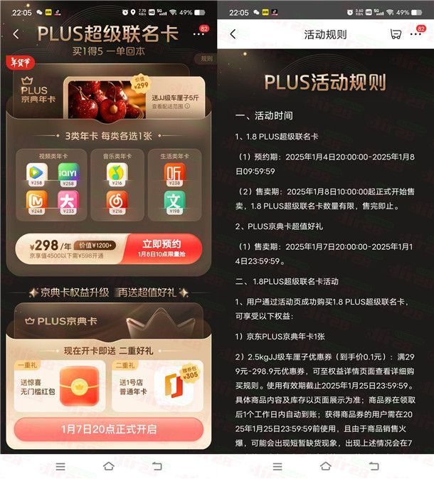 这是京东开超级联名卡的活动,觉得划算的可以预约到点去抢,通过打开京东进去活动里,京亨值4500以上可以298元开通1年京东PLUS超级联名卡(1月8日10点限量抢),开通会得到1年京东PLUS会员+5斤JJ级车厘子+腾讯/爱奇艺/芒果TV/B站会员年卡+QQ音乐/网易云会员年卡+喜马拉雅/百度文库文库会员年卡。