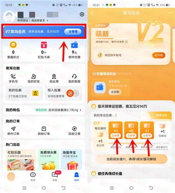 小编提示:打开最新版本“菜鸟”APP,在【我的】页面点【菜鸟会员】进去,完成简单的任务升级,可以在领幸运包裹那里领到多个淘宝无门槛红包,周五还可以瓜分50万红包,每天都可以去领,刚累积加起来领到4元左右,可以购买淘宝商品抵扣,每次最多可用10个红包