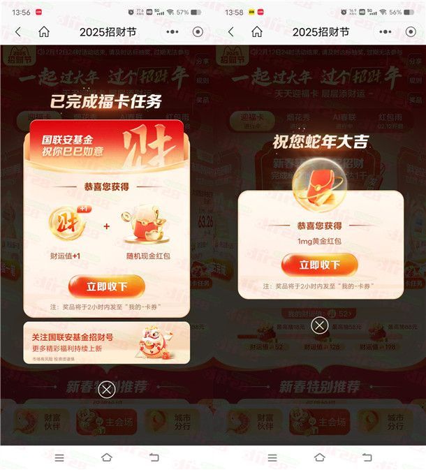 招商银行2025招财节抽多个现金红包、黄金红包 亲测中1.5元