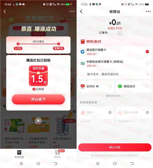 京东简单领1元以上红包的活动,通过先打开微信或者京东APP先将1元水杯加入购物车,然后再去“京东金融”APP搜索【天天领红包】进去点弹窗领1次红包,然后再暴涨一下就会得到1元以上支付红包,然后在“京东金融”APP里搜索【购物车】进去付款就可以用红包抵扣,最后只需付0.01元,必须要在京东金融APP里付才可以用红包。