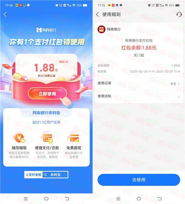 速度去 支付宝网商银行直接领1.88元无门槛支付红包 亲测秒到