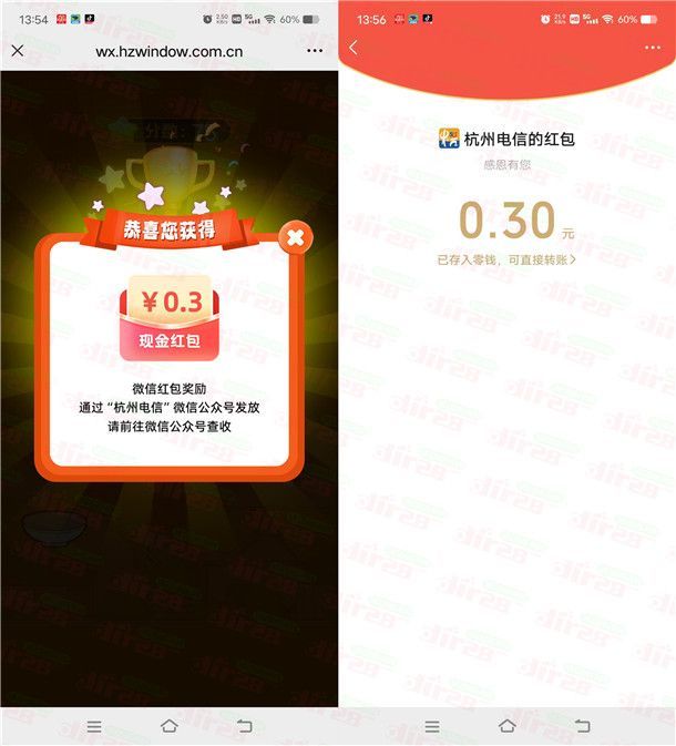 杭州电信接馅饼小游戏抽0.3-5元微信红包 亲测中0.3元秒推