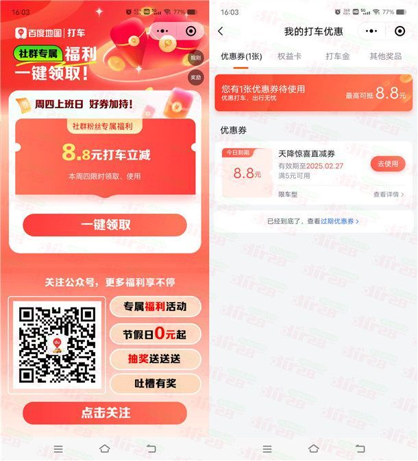 百度地图周四上班日直接领8.8元无门槛打车券 限今天使用