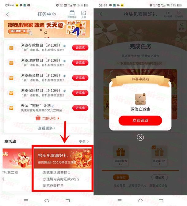 小编提示:打开“中国工商银行”APP搜索【任务中心】进去,下拉页面在享活动那里左右活动点【抬头见喜赢好礼】进去,完成简单的任务抽,刚中1元,非必中