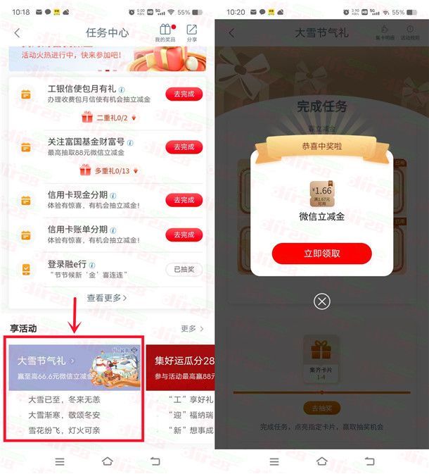 小编提示:打开中国工商银行APP搜索【任务中心】进去,下拉页面在享活动那里点【大雪节气礼】进去,完成4个简单的浏览任务集卡片,集齐4张不同的卡片可以合成抽奖,刚中1.66元微信立减金,非必中