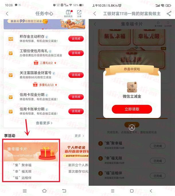 工行集幸福卡片活动抽1.88-88元微信立减金、实物 亲测中8元