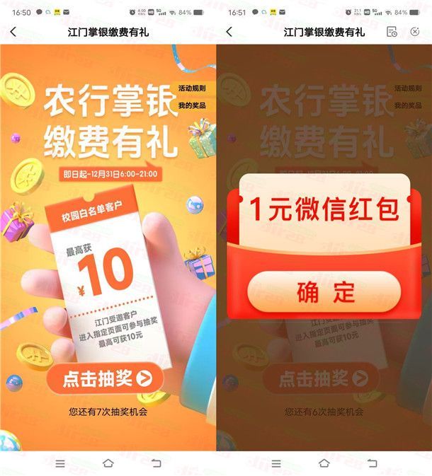 农行掌银缴费有礼活动抽1-100元微信红包 亲测中3元秒推