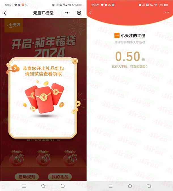 参加小天才电话手表举办的开启新年福袋抽红包活动,通过打开微信进去小程序活动里,首次进去可以直接开福袋抽奖1次,关注视频号还可以再抽1次(不用真的关注,只要点击了我已关注就行),小编测试中到0.5元红包秒推,非必中。