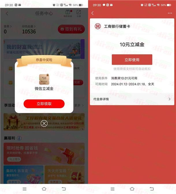 这个活动只有部分工行地区的特邀用户才可以参加,有入口的可以去,通过打开中国工商银行APP搜索【任务中心】进去,如果有看到,有显示“特邀客户产品体验”任务的,按照提示点进去随便买1元任意货币基金就可以抽奖,有机会中到10元微信立减金,小编测试中到10元秒到。