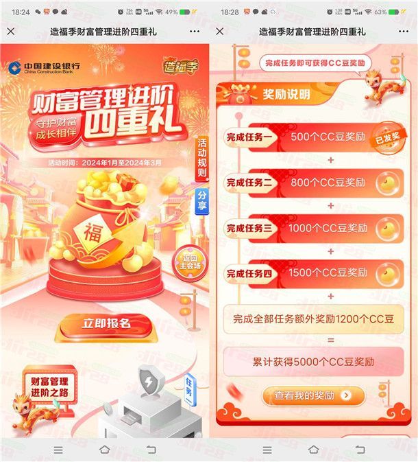 建行财富管理进阶四重礼领500-5000个CC豆 价值5-50元