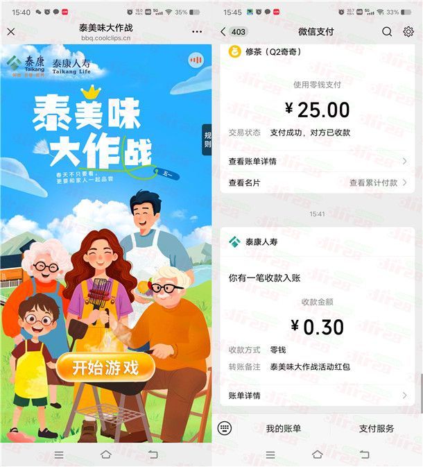 参加泰康人寿举办的泰美味大作战小游戏抽红包活动,通过打开微信进去活动里,小游戏中按照提示在20秒内完成烧烤就能完成任务,完成后就可以抽奖1次,有机会中到随机金额的微信红包,小编测试中到0.3元红包秒推。