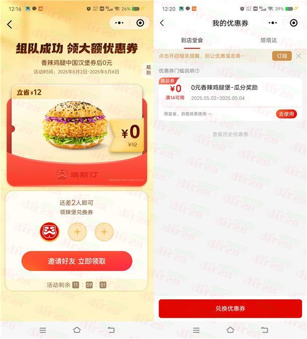 塔斯汀小程序3人组队领取0元香辣鸡腿堡 需随单使用