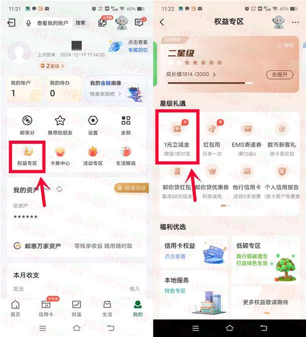 参加邮储银行举办的星级专享月月领活动,通过打开邮储银行APP进去权益专区页面,需要二星级才可以参加,如果不足二星级可以完成指定的任务达到二星级,二星级可以领到1元微信立减金、或者1元支付宝红包,最高可以领到6元微信立减金或者6元支付宝红包,领取后秒到账,每个月都可以领1次。