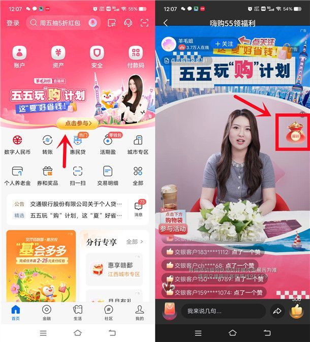 立即参与:打开交通银行”APP首页点顶部图片进去直播间参加