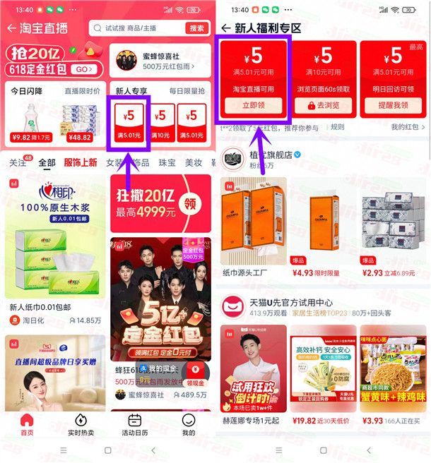 淘宝0元撸纸巾的活动又来了,通过打开“淘宝”APP搜索【淘宝直播】进去领5元新人红包(如果没有5元红包就换淘宝号领),领到5元红包后再去商品页面领一个5元券,然后就可以去直播间里下单购买1大提悬挂抽纸包邮。