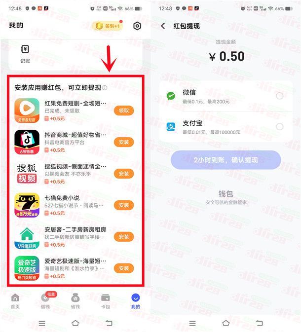 小编提示:打开vivo手机、iqoo手机自带的“钱包”APP,在【我的】页面下拉如果有看到安装应用赚红包就可以参加,每下载1个APP体验15秒领0.5元红包,10个APP加起来5元,可以提现到微信或者支付宝