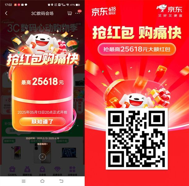 2025年京东618超级红包开始了,通过打开京东进去活动里,每天都可以领1次超级现金红包,必中的,红包金额最高25618元,每天都可以反复抽3次,在红包首发当日、以及红包加码日还有概率领到大额红包,累积得到的红包可以在京东购买任意实物商品无门槛抵扣使用,这段时间每天都可以去领,这个活动是必中的。