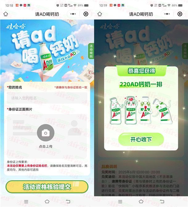 参加娃哈哈举办的请AD喝钙奶活动,通过打开微信进去小程序活动里,名字只要首个字母带A或者D,就可以免费领取到娃哈哈AD钙奶一排,领到后需要去当地门店领取,限量10万份。
