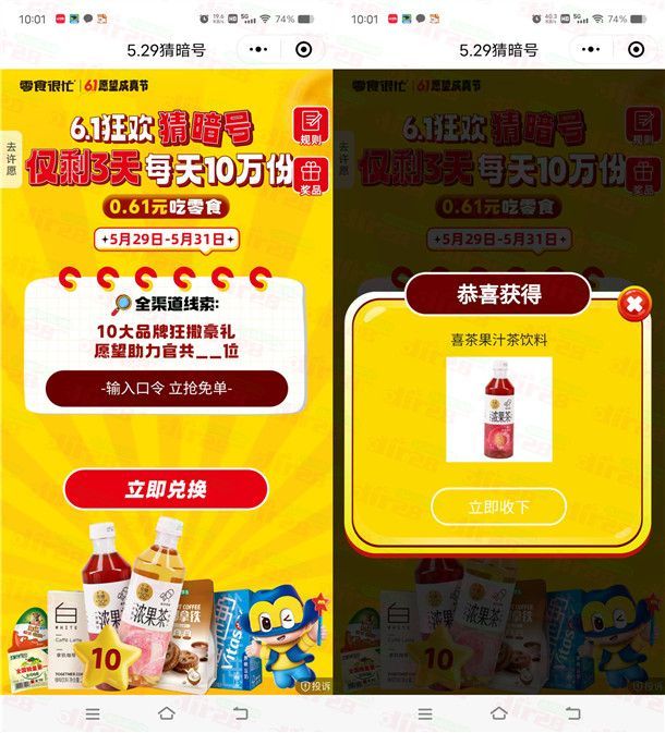 零食很忙6.1狂欢猜暗号抽10万份零食、饮料 亲测中喜茶饮料