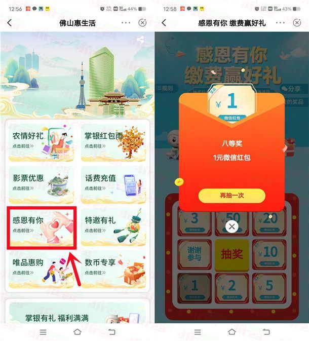 参加农行举办的感恩有你缴费有好礼活动,通过打开“中国农业银行”APP,点“感恩有你”进去活动里,每支付1.1元可以抽奖1次(支付的钱会原路退回,不会反撸),能参加的必中1-50元微信红包,刚中1元,全国都可以去,部分用户如果提示非受邀就参加不了。