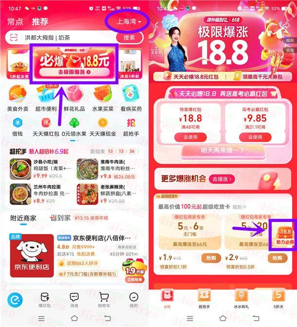 小编提示:打开“饿了么”APP,首页先点右上角地区手动修改为:上海任意地区,再点首页顶部横幅【必爆18.8元】进去,再点右侧图标【助力必得18.8】进去,邀请5个好友或者小号助力领18.8元无门槛外卖红包