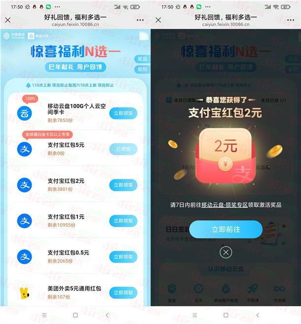 参加移动云盘举办的好礼回馈惊喜福利N选一活动,通过打开微信进去活动里,登录后可以直接领到0.5-2元支付宝红包、0.5-2元微信立减金,小编测试领到2元秒到,这个活动每个月都可以领1次,每天不定时补充库存,部分用户领不了。