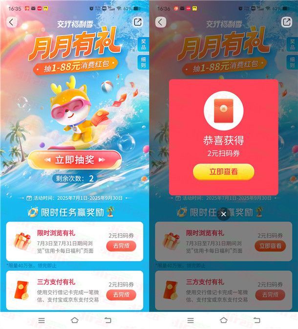 小编提示:打开“交通银行”APP搜索【月月有礼】进去,2个限时任务可以领到2个2元扫码支付红包,下面几个任务完成还可以抽1-88元支付红包