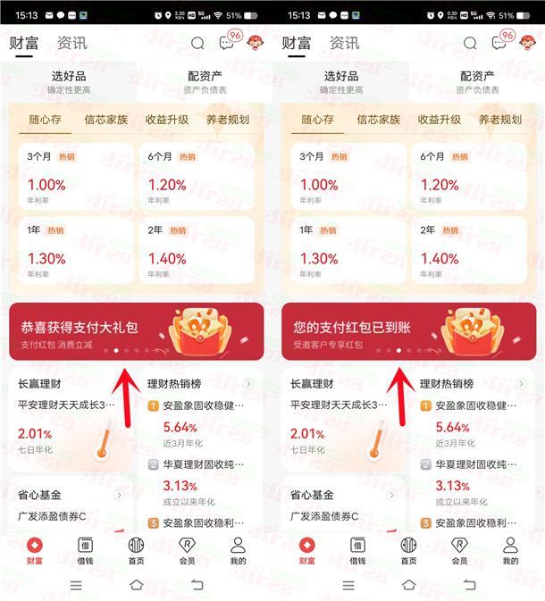小编提示:打开“中信银行”APP,点底部【财富】再点中间滚动图【恭喜获得支付大礼包】和【您的支付红包已到账】这2个进去可以领到2个支付宝红包,需要点击去使用兑换就会到账,刚领到3+3元,跟昨天的不冲突都可以去,如果没有入口就参加不了,注册过中信银行二类电子卡的也可以去