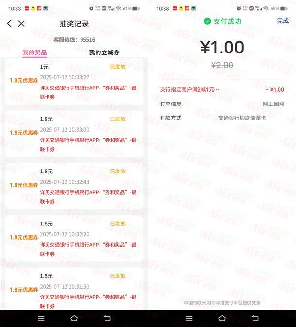 交通银行抽云闪付券 亲测中9.2元 可10充20元电费、话费