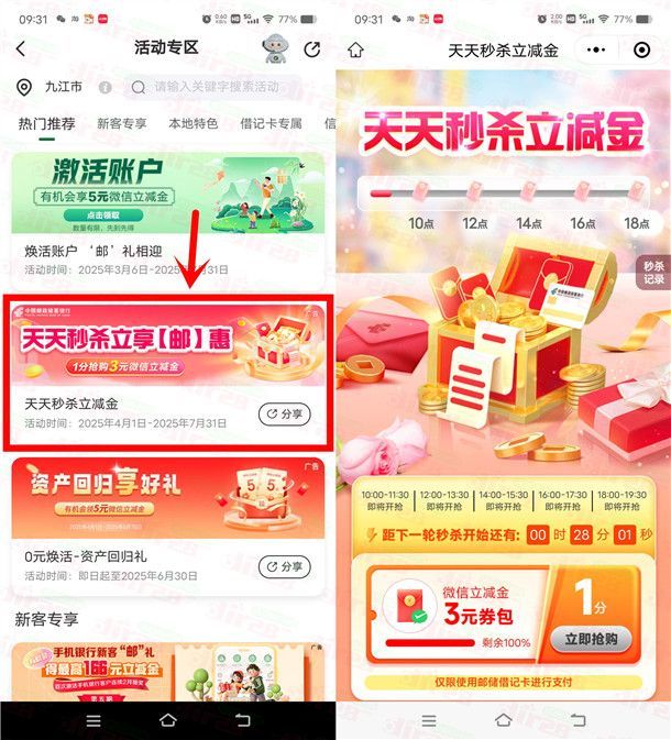 小编提示:打开“邮储银行”APP,首页点【活动专区】进去,下拉页面找到【天天秒杀立享邮惠】进去跳转到微信小程序里,每天10点、12点、14点、16点、18点整可以0.01元秒杀3元微信立减金,每场限量1350个名额