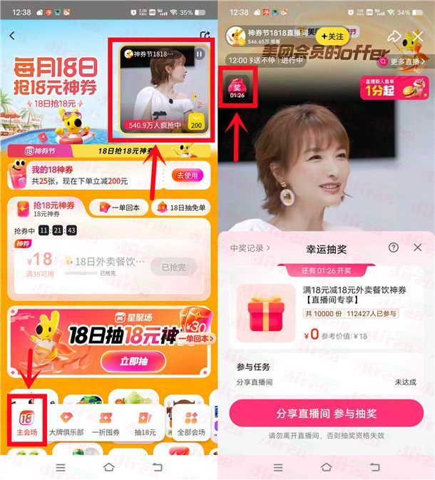 参加美团举办的神券节直播间抽18元外卖券活动,通过打开美团APP进活动里,点底部“主会场”再点右上角进去直播间里,在直播间左上角点福袋图标,每20分钟抽1万张18元无门槛外卖券,这个活动可参加多次,非必中。