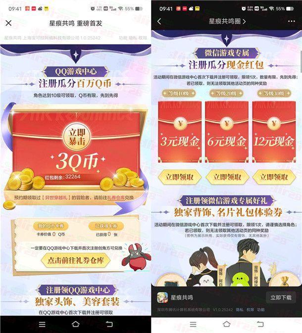 今天上线的一个新的腾讯游戏活动,通过打开微信和手机QQ进去活动里下载星痕共鸣app手游客户端,首次注册登陆游戏并且达到10级可以领到3个Q币、3元微信红包,完成其他等级要求还可以领取红包和Q币,每一个挡位的红包和Q币数量限量。