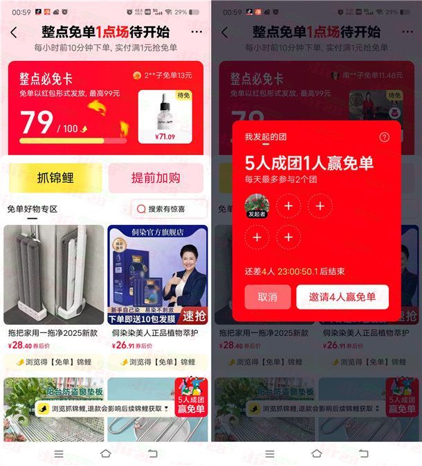 天猫5人组队1人得必免卡 每个整点下单必得最高99元免单红包