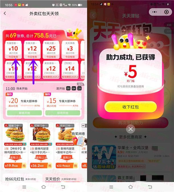 这是2个美团撸外卖券的活动,因为可以叠加抵扣,所以写在一起便于大家一起参加,通过打开微信进去活动里,第一个活动进去可以直接领到一张满15减10元外卖券,第二个活动邀请4个好友助力领5元无门槛津贴,可以叠加一起抵扣使用,叠加抵扣还是很划算的。
