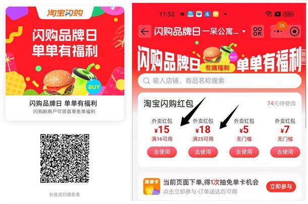 淘宝闪购这个活动每天都可以去参加领取,通过打开淘宝APP进去闪购活动里,每天都可以领到最高15元饿了么外卖券,今天部分人还可以领到满16减15元、满25减18元饿了么外卖券,得到的外卖券可以在淘宝里点饿了么外卖使用。