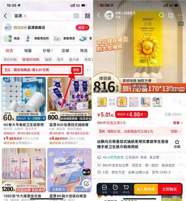 小编提示:打开“天猫”APP搜索【蓝漂】,部分用户在搜索页面可以领到5-8元无门槛通用红包,并非每个号都有,如果有红包就可以复制下面淘口令打开“天猫”0.01元撸1提悬挂抽纸